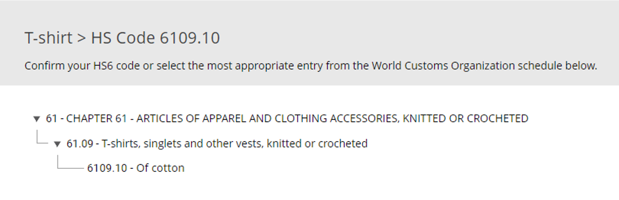 HS codes allow customs officials to quickly identify the contents of a parcel. These codes are six digits long and are comprised of a chapter, heading and subheading. The first two digits are the chapter. This is the broadest category for the item. The second two digits are the heading. And the last two digits are the subheading—these are separated by a period. Let’s look at a cotton t-shirt as an example.
